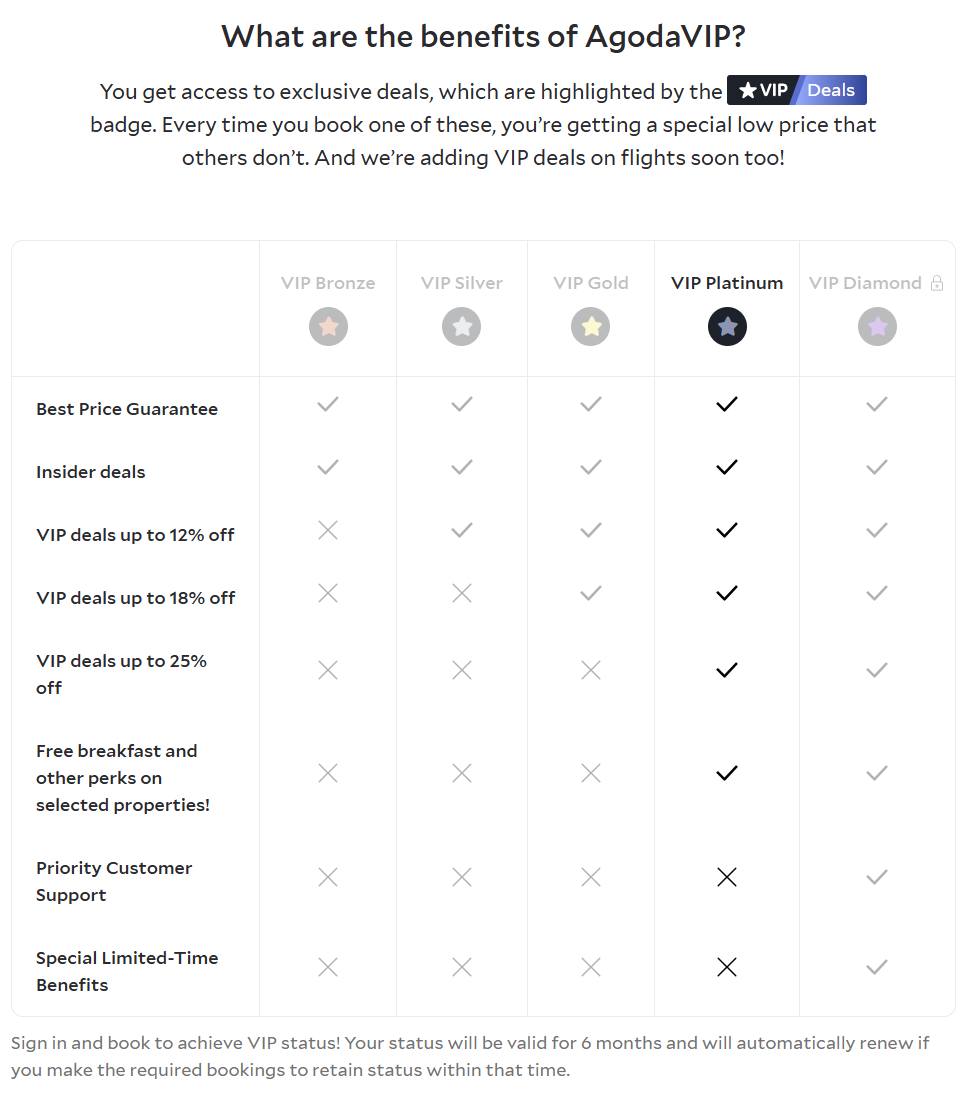 If you believe the table below, sorry, you're a sucker. Listed are meaningless benefits which I explained in detail at my Agoda VIP loyalty program review.