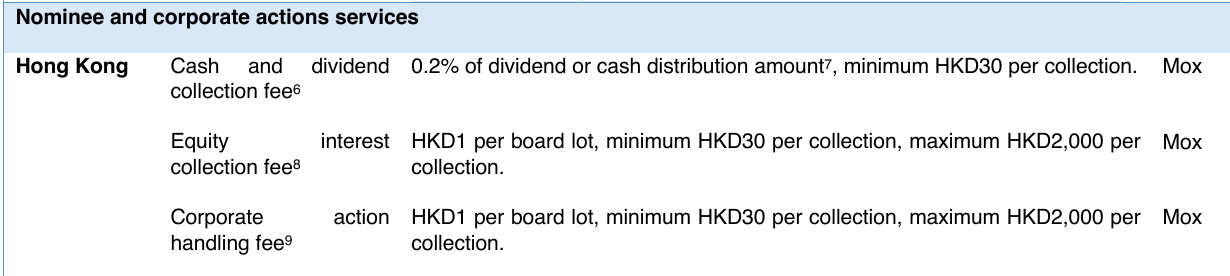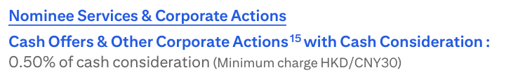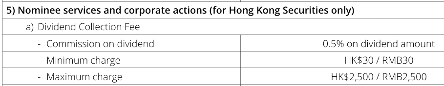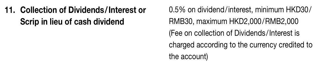 For dividend collection fees, let's compare a few other banks in Hong Kong. Banks in HK typically charge the greater of the fee percentage and minimum fee. e.g. if you receive $10K in dividends, a 0.5% dividend fee is $500. The bank will collect $500 instead of a minimum dividend fee of $50.