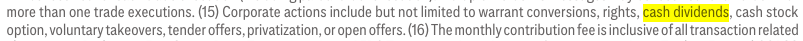 and here's the fine print explaining how corporate actions includes "cash dividends". My feedback is for Citi to make it more transparent. I commend them on attempting the simplify the fees across account tiers, but for some people, burying the details in microscopic text that cannot be easily read without a magnifying glass seems unfair.