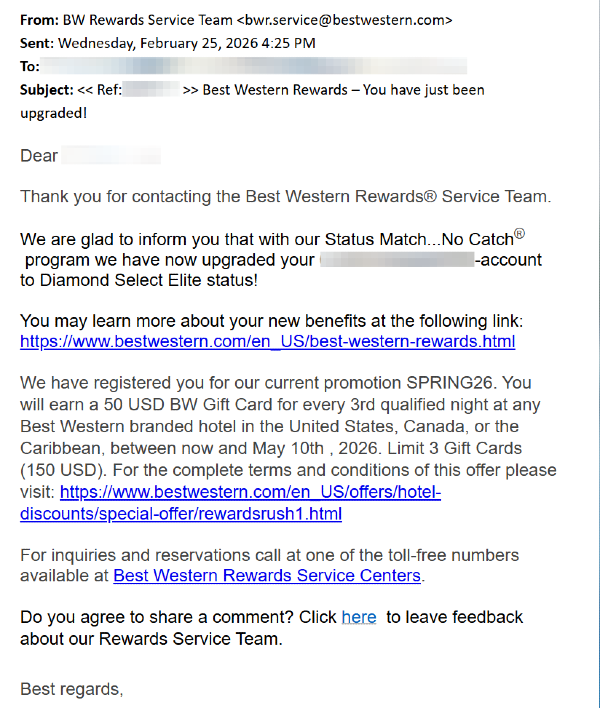 At 11:21am (3:21 UTC) I sent a brief email shown below with the information listed on the Best Western Status Match page.