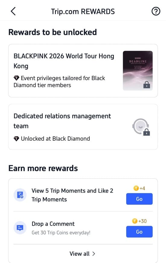 There are hidden benefits of this tier that are not listed on Trip.com's loyalty program website. For example, access to the VIP area of the Blackpink concert from Jan 24-26 2026 in Hong Kong!