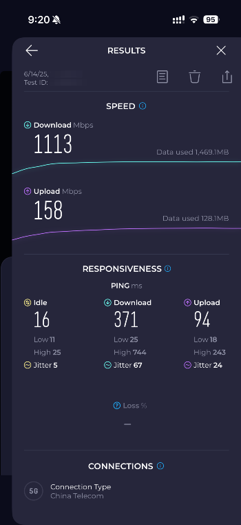 So just how fast is 5G-A? My record was 1.1Gbps. See below. I sometimes disable WiFi in the evenings to get faster downloads because the wired broadband connection is competing with my neighbors for bandwidth. It's amazing to download a full-length movie in under 1 minute. Going to watch a movie at the cinema/theater is for the novelty honestly. It's amazing to me cinemas/theaters still exist.