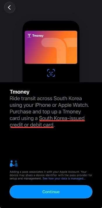 This is because only South Korea-issued credit cards can be used to fund the card. This means only residents would have the required credit card. Tourists are able to create a T-money card in Apple Wallet, but unable to fund it. Save yourself some time and don't bother trying.