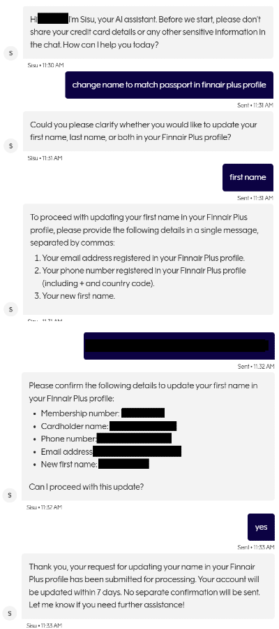 Finnair lets you do a first name change by just using chat! No wait times on the phone and passing files. This is much better than Cathay Pacific's horrific experience for account management.
