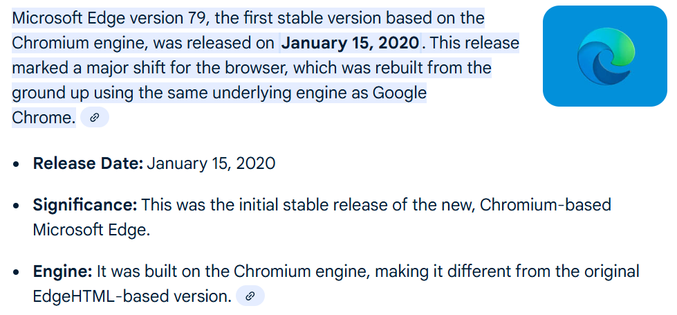 A search will show Microsoft Edge version 79 was released on January 15, 2020.
