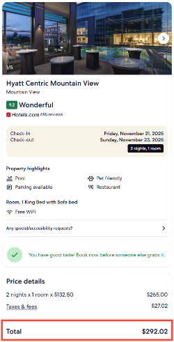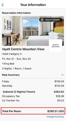 But the truth is not 10% rewards cash back because the rewards is based on hotel spend, excluding taxes and fee. Hotels.com also charges a markup on its room prices compared with direct prices. In my example below, it's $1.51 (0.52% more on hotels.com) for a 2-night stay, when compared to Hyatt, which also offers a spend-based rewards program.
