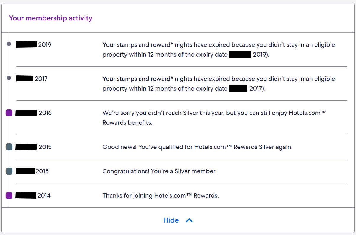 - Membership activity page is easy to understand and useful - no sifting through pages to understand my activity and expirations. Sadly for hotels.com though, I switched to the big chains around 2019 and completely stopped using hotels.com. I value predictable hotel benefits (and money savers) such as breakfast at no extra cost, which is especially important when traveling with family.