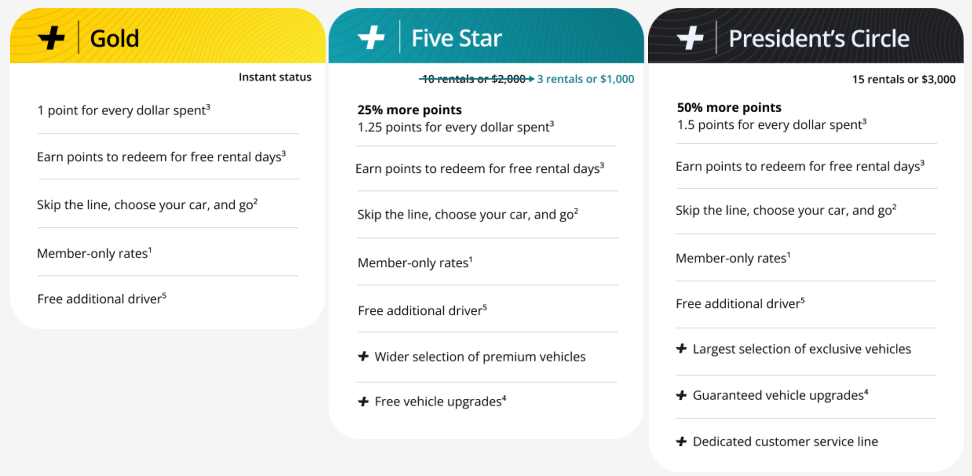 | Hertz Gold | Hertz Five Star | Hertz President's Circle | SIXT Gold | SIXT Platinum | SIXT Diamond | |