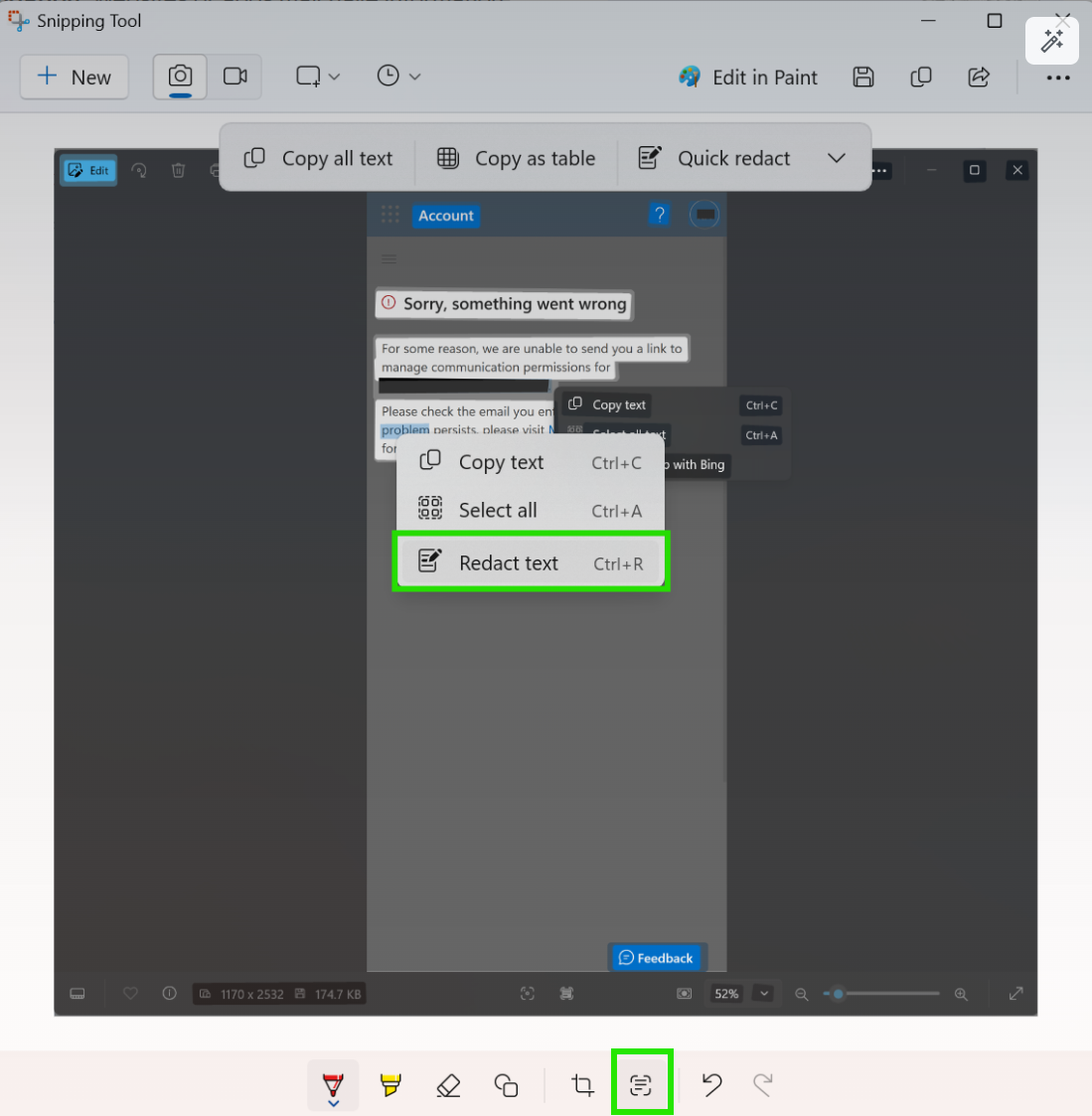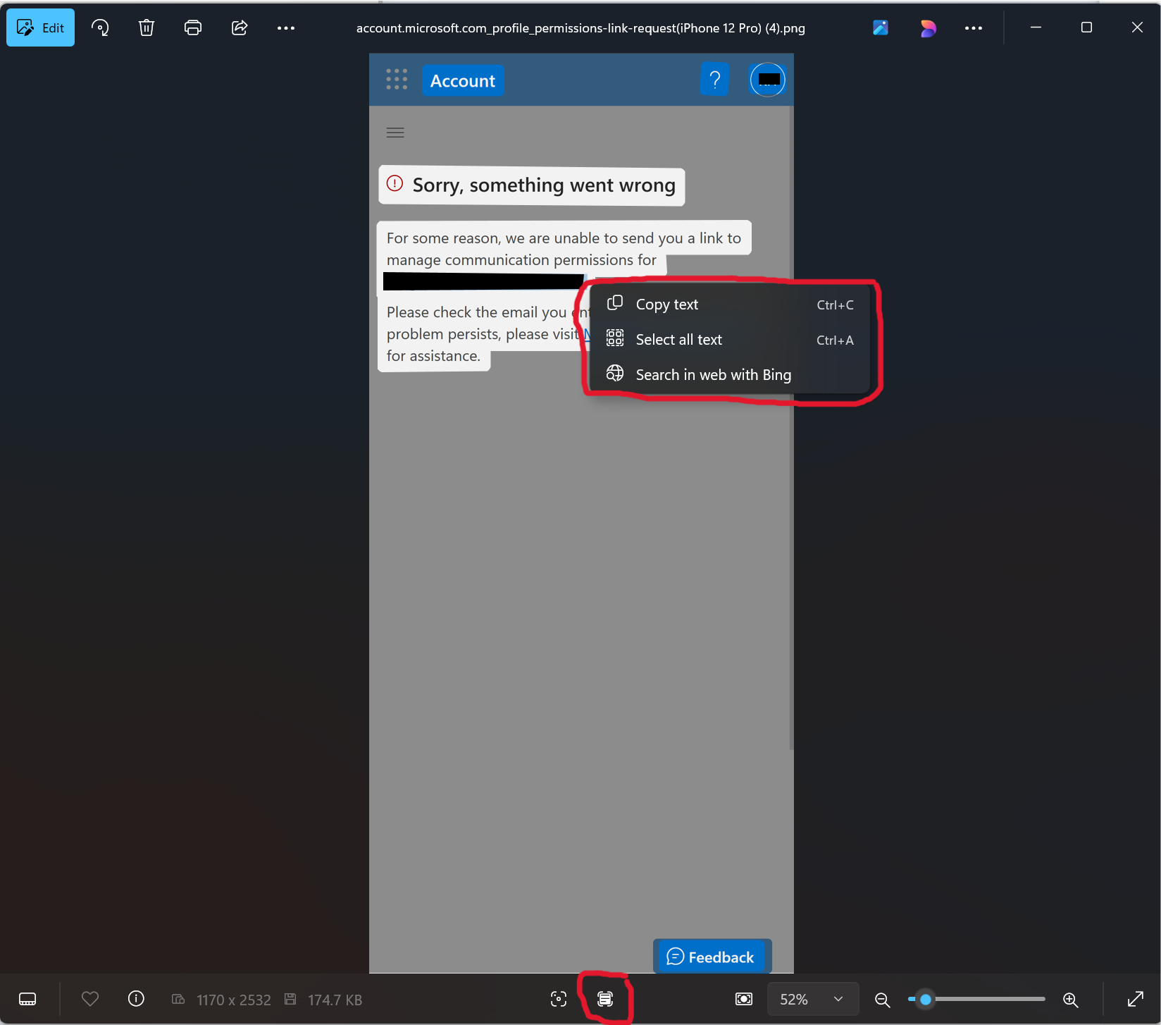 Look at the screenshot below from the Photos app on Windows. There's an option to Scan Text using the button at the bottom of the Photos app. When you highlight the text you want to redact - an email address in my example - there is no such option in the context menu. Why did I expect such a capability? This is because Snipping Tool offers it. Same (Scan Text) button, different outcomes.