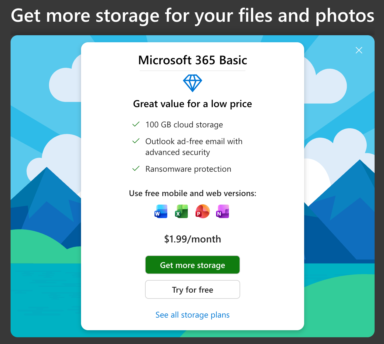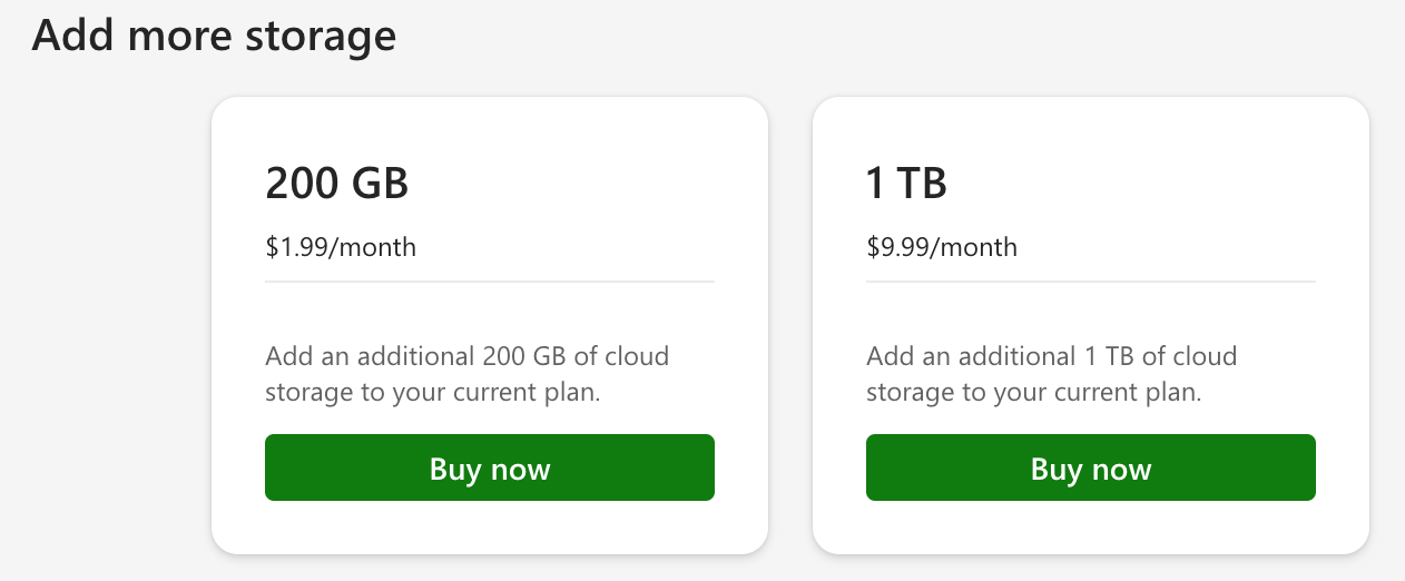Like I said, most people are in "it" (M365) for the storage. If you need storage beyond what M365 Family offers, after you purchase M365, you'll see options like the one below.