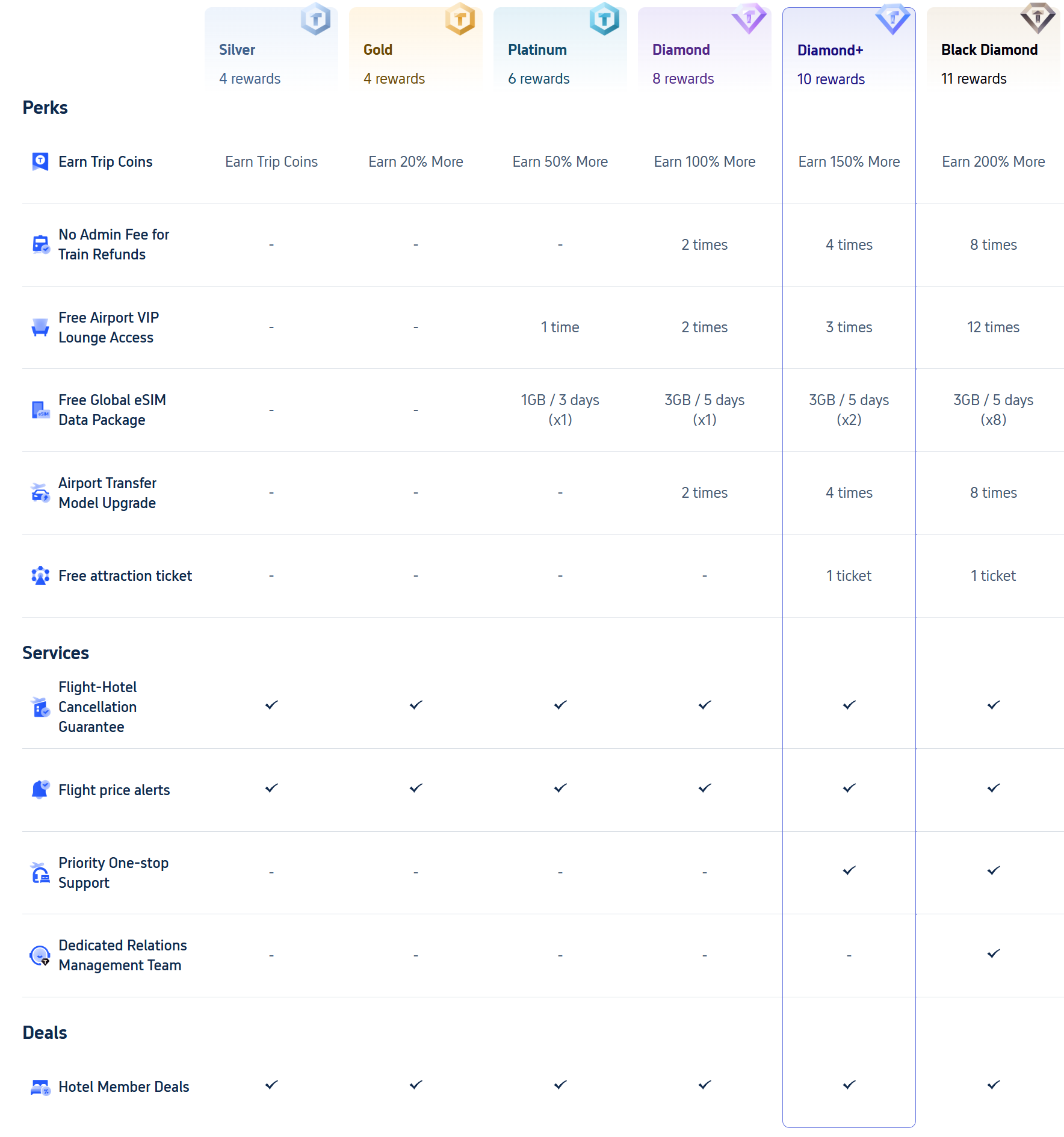 - Diamond+ - $10K spend. You didn't get here by gaming the number of bookings, so you likely didn't care about the lower tier benefits before and got here because Trip.com is easy to use. Now that you hit that level, it seems like a waste to not use the benefits you earned, so you do.