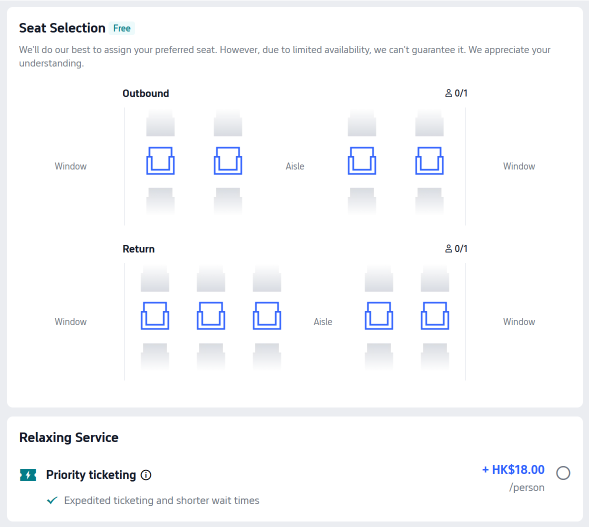 While there are some pictures, I think the user experience for choosing seat class is less friendly than Trip.com as you cannot tell much from the pictures other than seat configuration.
