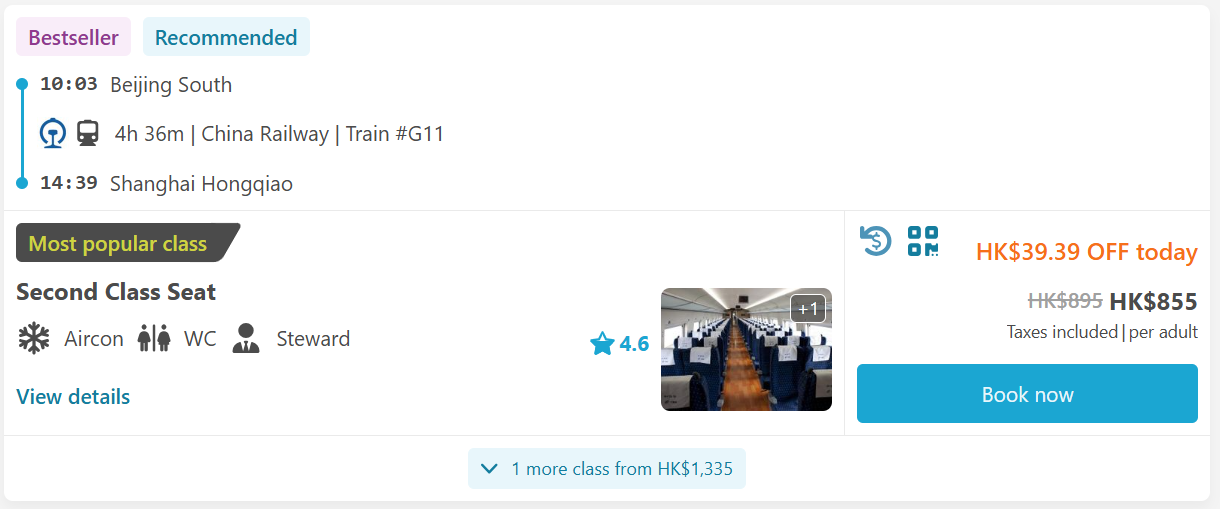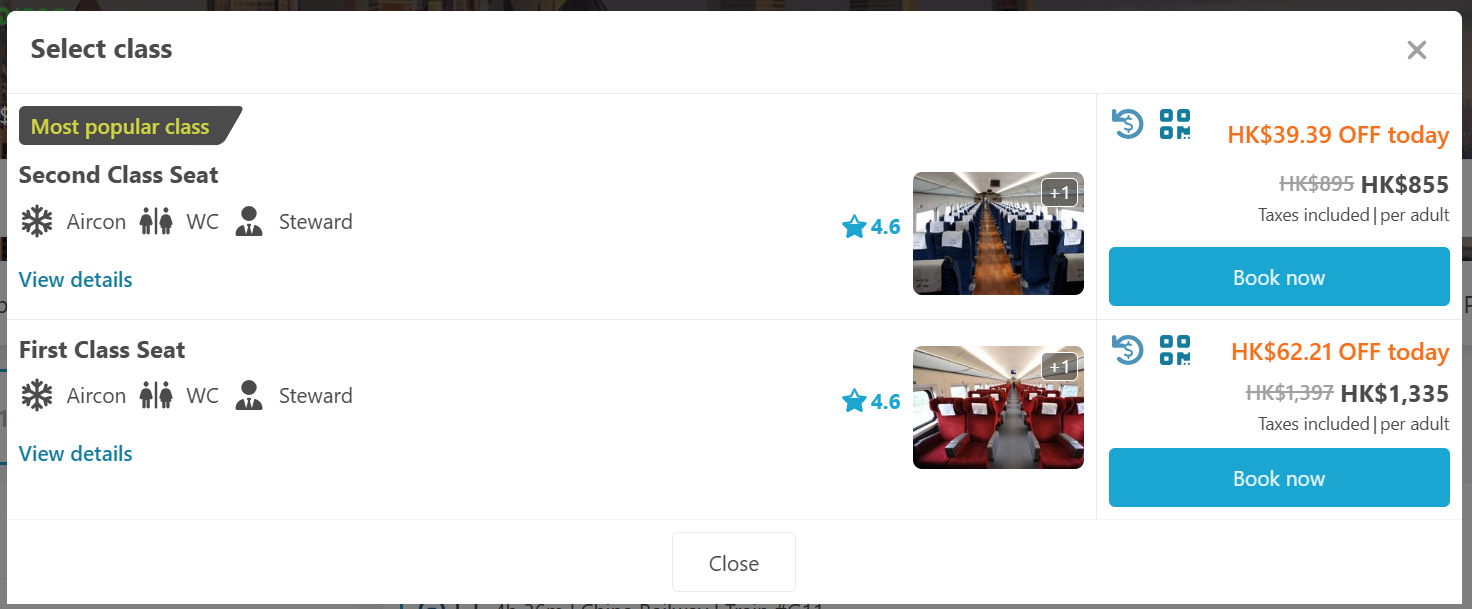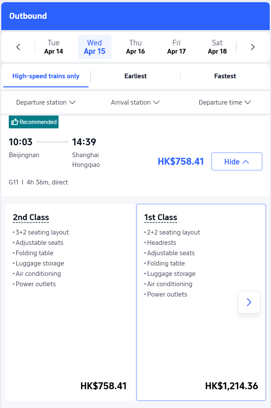You have to click on 1 more class from HK$1,355 to see First Class, but information on differences between seat class is less clear compared to Trip.com
