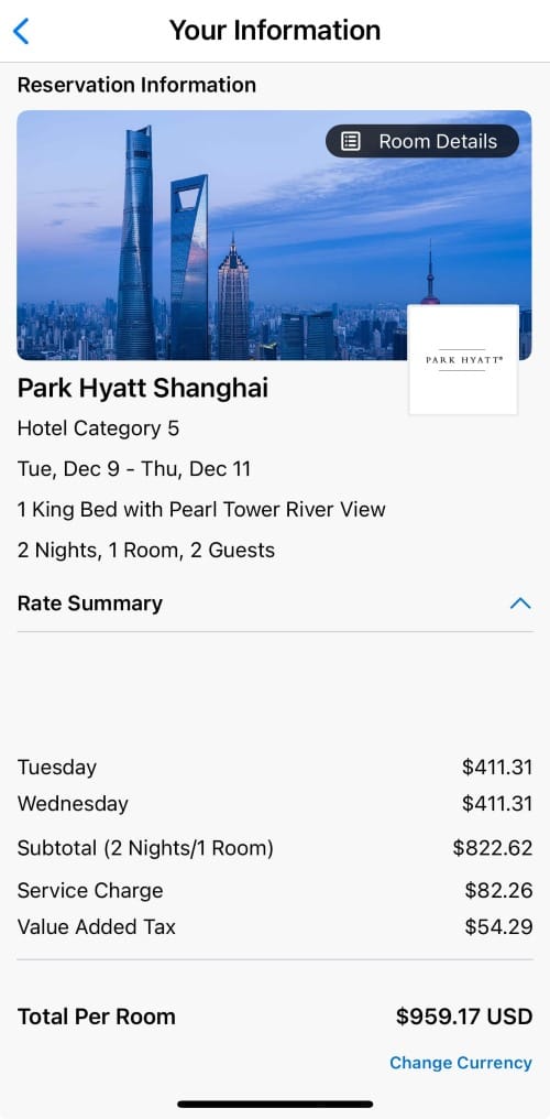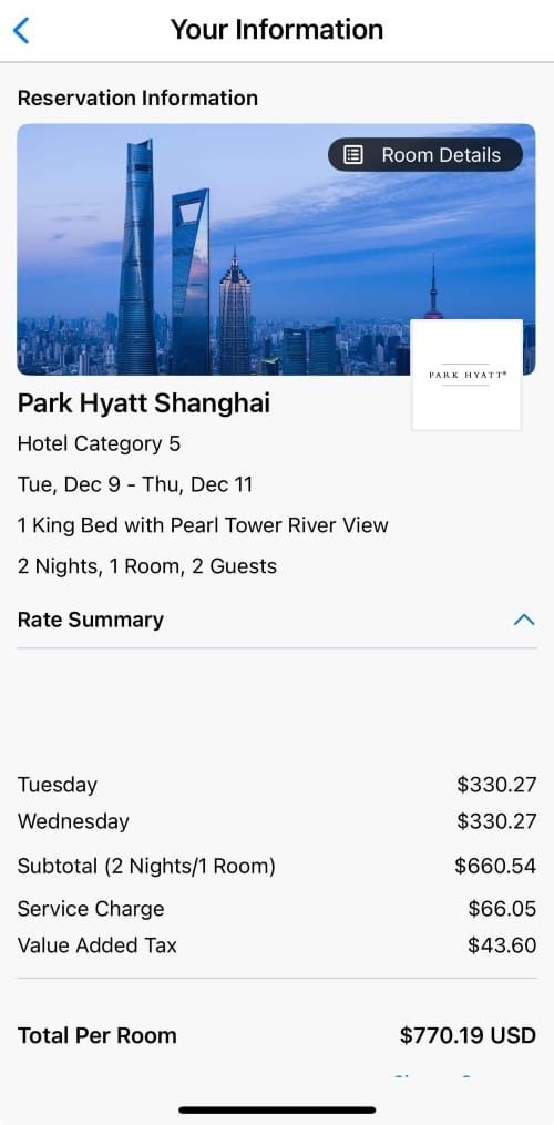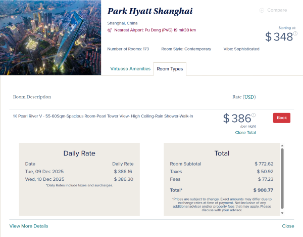 - Booking through Virtuoso, it's $386.22 per night when booking a 2-night stay at the Park Hyatt in Shanghai.